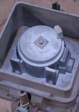 上型の鋳型をバイブレータかけて抜き上げ、つぎにマッチプレートにバイブレータをかけて木型を引き上げます。