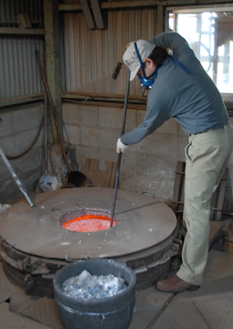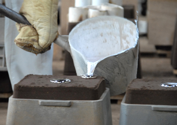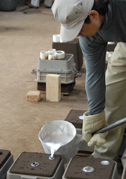 砂型の「湯口」に溶解したアルミ合金を流し込んでいきます。